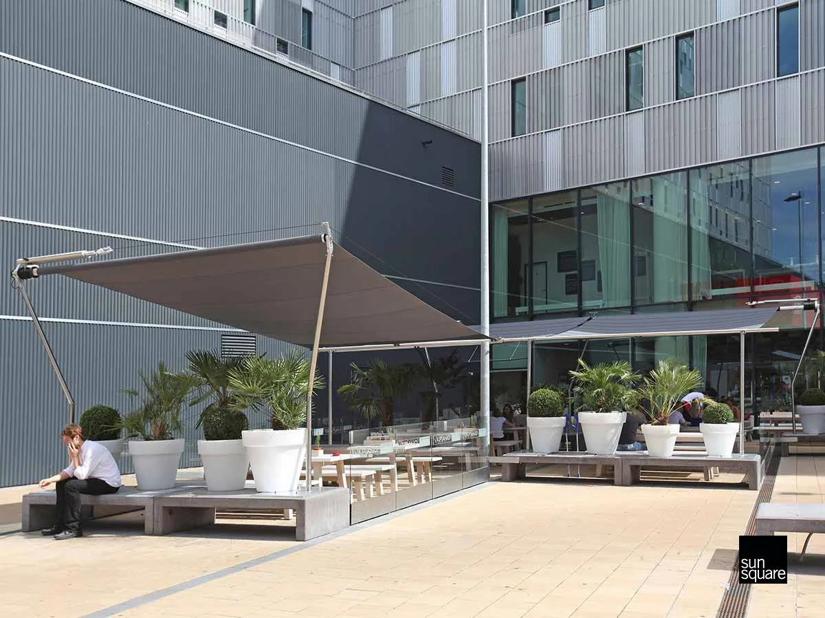 Freistehender Sonnen- und Regenschutz. Schaffen Sie mit der schlanken Silhouette des SHADECUBE einen edlen Blickfang.