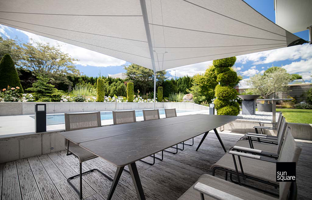SunSquare ist der Erfinder von vollautomatischen, funkferngesteuerten und windüberwachten, rollbaren Sonnensegel-Anlagen.