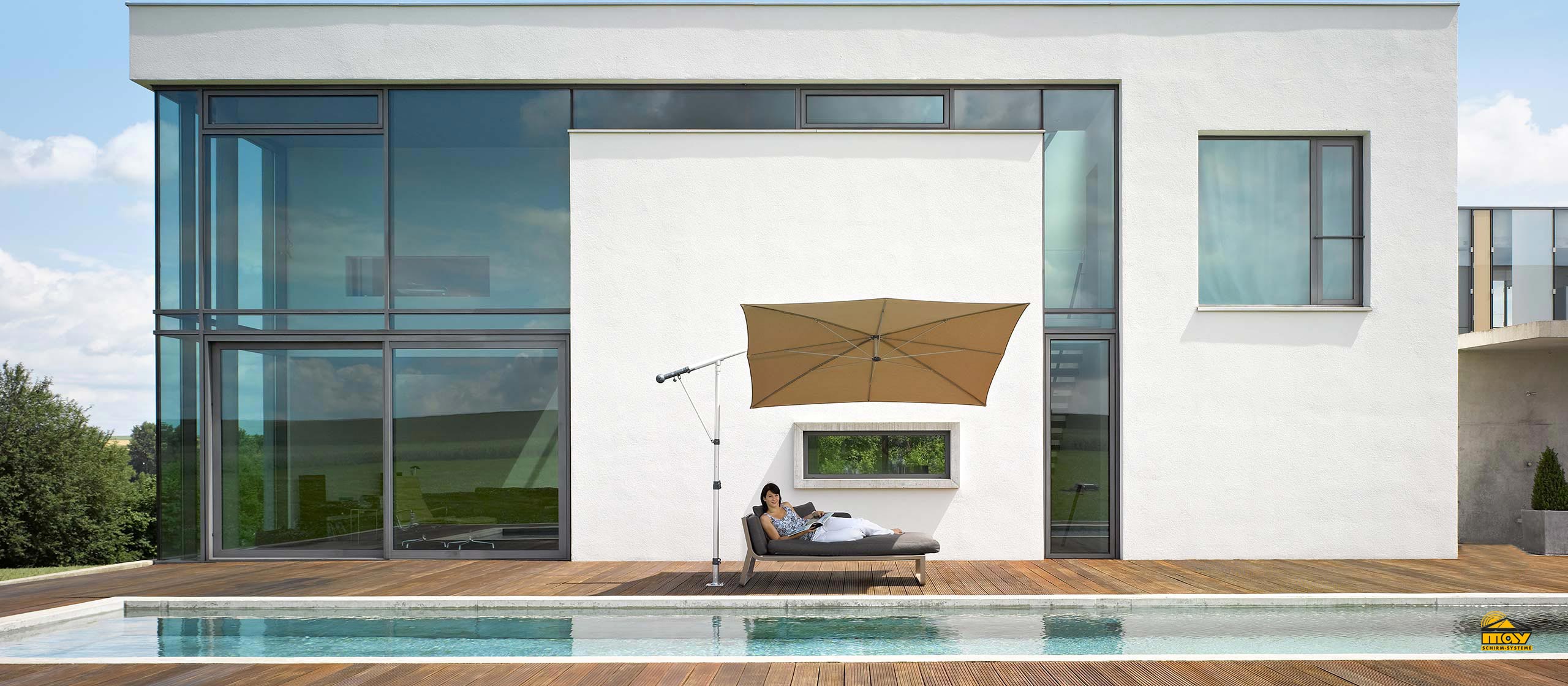 Albatross-Mittelarmschirme von MAY sind Großschirme. Sie können in der runden Variante eine Fläche von bis zu 75 m² überspannen, während die viereckige Variante ungefähr 56 m² schafft. Letztere unterteilt sich in quadratische und rechteckige Schirme. Wie die Schattello- bieten auch die Albatross-Produkte hohe Windsicherheit sowie eine Allwetter-Funktion. Darüber hinaus besteht hier ebenfalls die Auswahl aus 70 Textildesigns sowie aus einer manuellen oder elektrischen Bedienung.