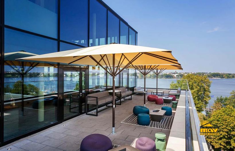 Schattello-Sonnenschirme von MAY haben einen langlebigen Korrosionsschutz und ein robustes Schirmgestänge. Es gibt sie mit elektrischer oder manueller Bedienung, mit einem Allwetterschutz und hoher Windsicherheit. Diese Mittelarmschirme von MAY existieren zudem mit 70 aktuellen Stoffdesigns und lassen sich individuell bedrucken, sodass der Sonnenschirm auch als Werbefläche dient.