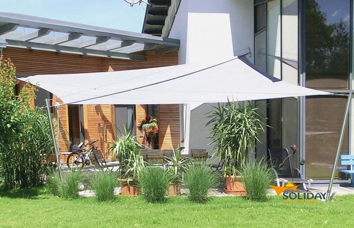 Durch unsere spezielle SOLIDAY-Welle kann das Sonnensegel manuell auf- bzw. eingerollt werden. Dadurch ist es möglich, den Schatten stufenlos von 0 – 65 qm einzustellen. Die Höhenverstellung ist auf einer Gleitschiene aus Aluminium montiert, und lässt sich im Bereich von 1,5 m individuell verstellen. Besonders wichtig bei tiefstehender Sonne am späteren Nachmittag. Das Verspannungsset bewirkt, dass alle Formen von Sonnensegeln machbar sind, und diese aufgerollt werden können. Somit kann jedes Sonnensegel individuell an die Architektur Ihres Gebäudes angepasst werden.
