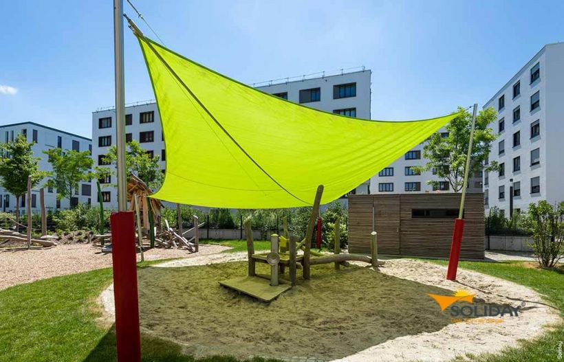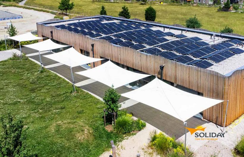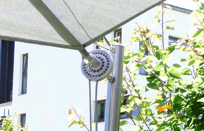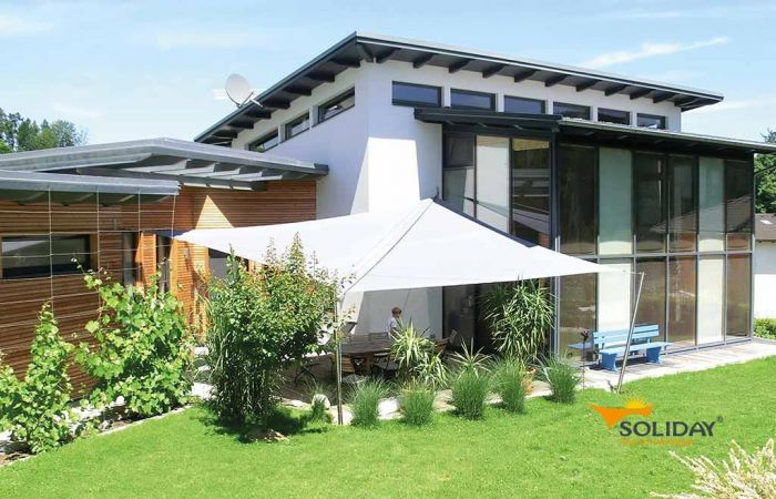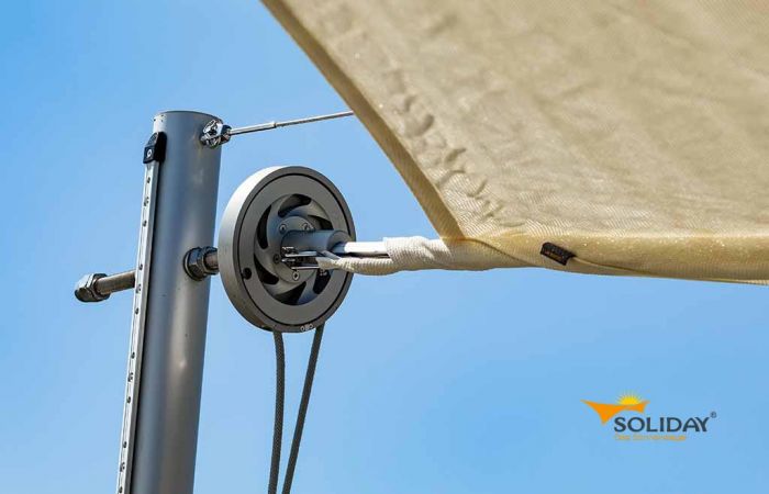 Eine weitere Besonderheit ist die patentierte Pylontechnik, durch die Soliday-Sonnensegel selbst Windgeschwindigkeiten von mehr als 40 km/h überstehen können. Ein Beispiel für ein manuell aufrollbares Sonnensegel von Soliday ist Soliday-M mit einer maximalen Segelgröße von 65 m².