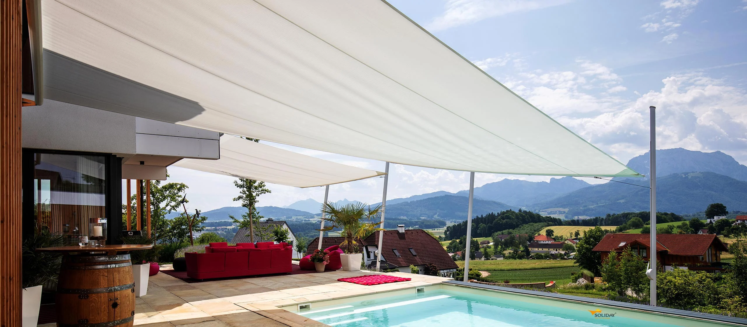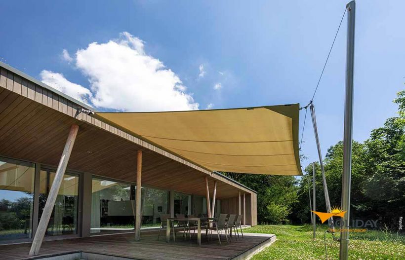 Soliday, eine Marke der Plaspack Netze GmbH aus Österreich, bietet Ihnen Sonnensegel nach Maß mit wahlweise elektrischer oder manueller Bedienung. Möglich sind bei Bedarf Lösungen mit Zwillings-Sonnensegeln, die über 100 m² überspannen. Soliday verbindet seine Produkte mit vielen interessanten Technologien. Zu ihnen gehört die dynamische Segelaufhängung, durch die Sonnensegel unterschiedlicher Größe im geöffneten Zustand immer gespannt bleiben.